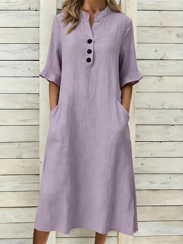Stilvolles Midikleid mit Stehkragen, Langarm und lockerer Passform. Jetzt entdecken und elegant durch Alltag, Urlaub und Ausgehen tragen.