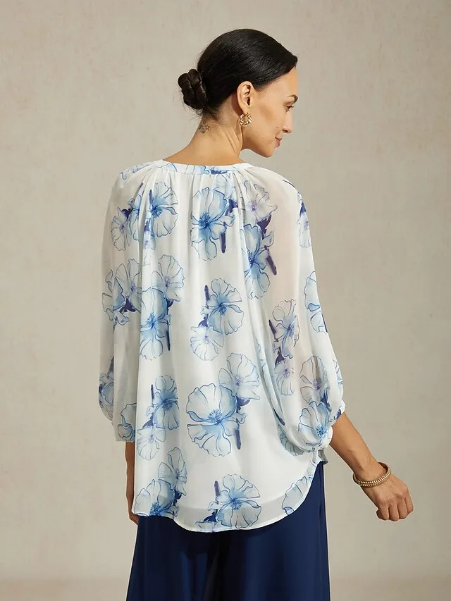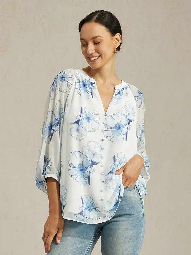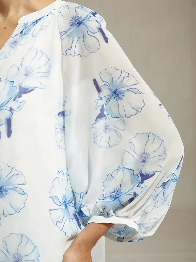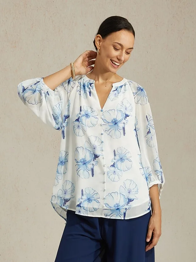 Elegante Chiffonbluse mit Blumendruck und V-Ausschnitt. Stilvoll, luftig und vielseitig für Büro, Alltag und besondere Anlässe.