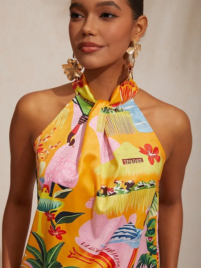 Elegantes Satin-Neckholder-Top mit Blumenmuster für sommerliche Looks. Leicht, feminin und stilvoll – jetzt entdecken.