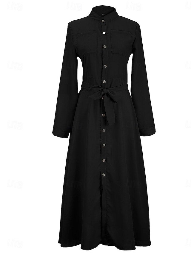 Discover elegance with our Maxi Lace-Up Dress, featuring a stand collar and long sleeves. Perfect for any sophisticated occasion.