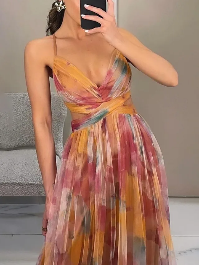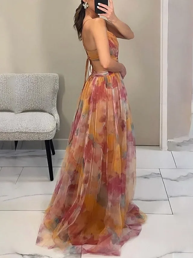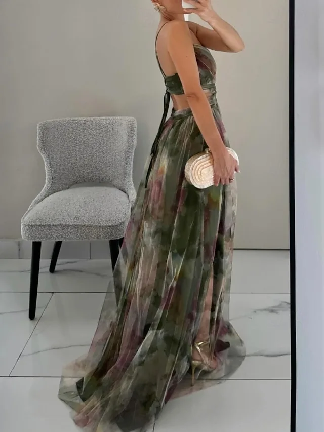 Fließendes Blumen-Maxikleid mit Spaghettiträgern und elegantem Look. Perfekt für Party, Tea Time und besondere Anlässe.