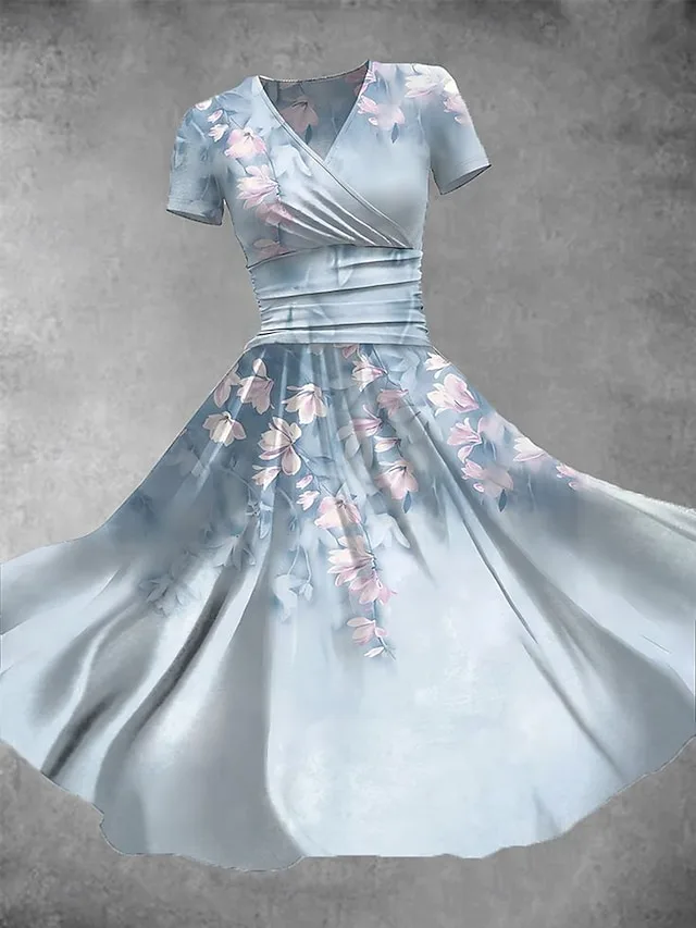 Elegant Normale Passform Blumen V-Ausschnitt Kurzarm Midikleid