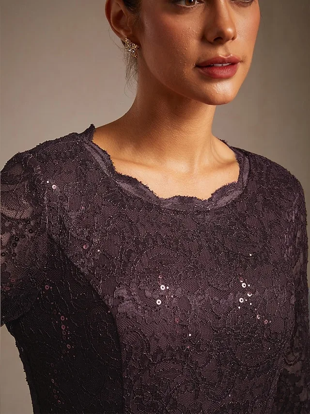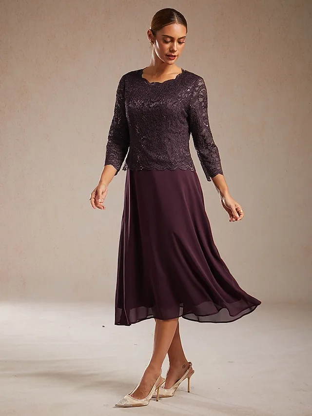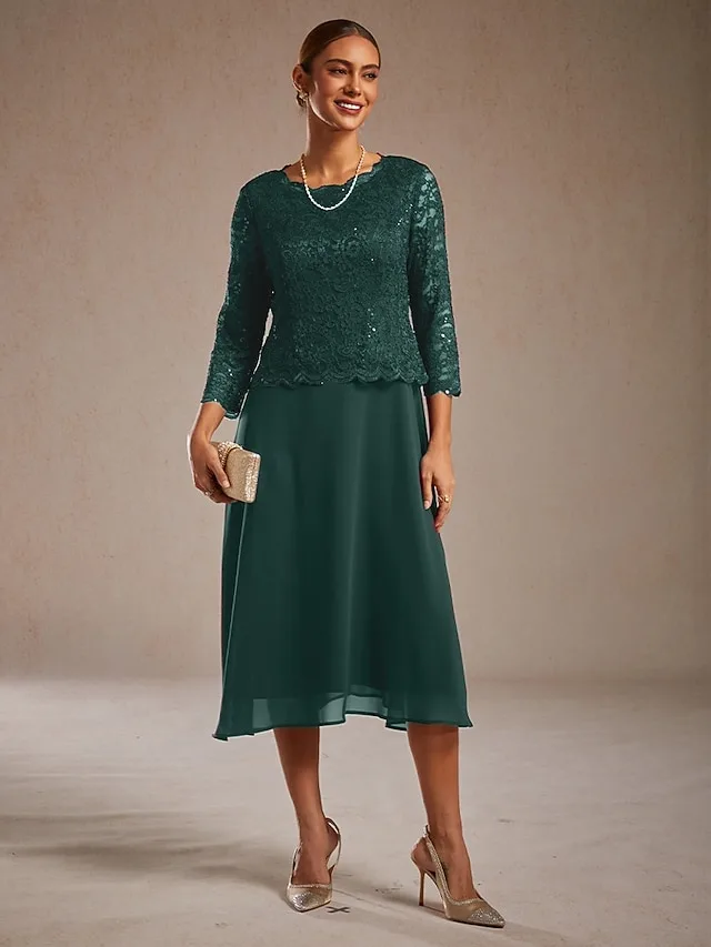Elegant Normale Passform Einfarbig Rundhalsausschnitt Dreiviertelarm Midikleid