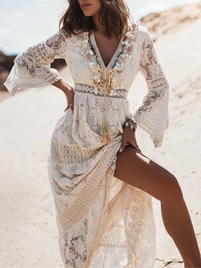 Discover elegance with our White Lace Maxi Dress, perfect for weddings and holidays. Regular fit, V neck, long sleeve – a boho chic masterpiece.