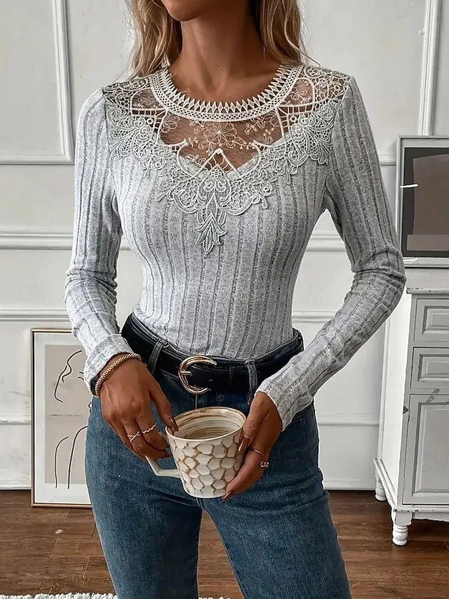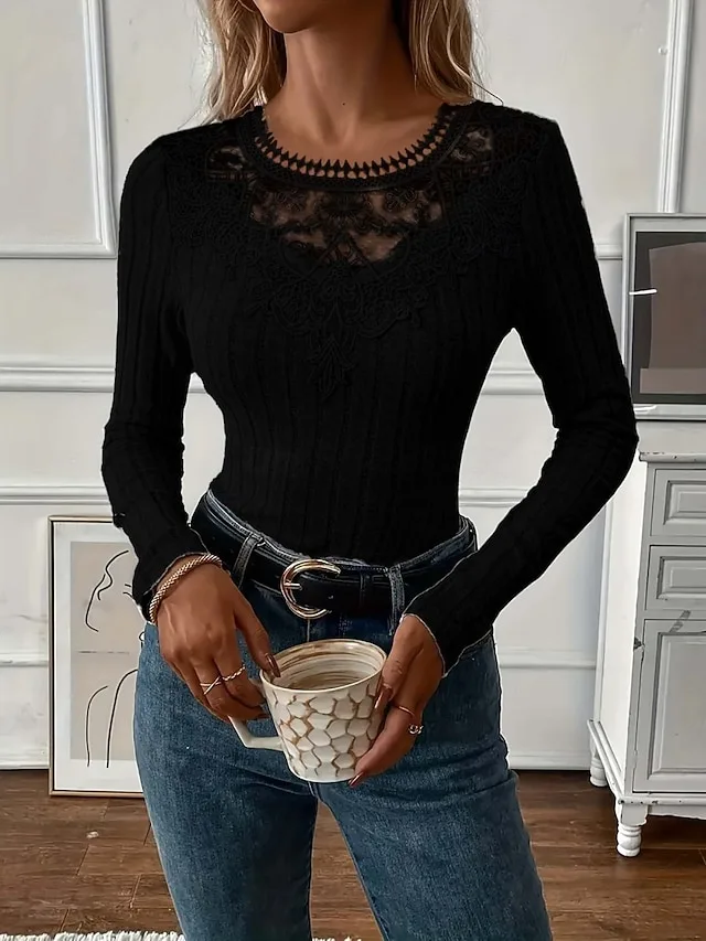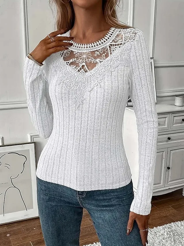 Stilvolle Spitzenbluse mit schmaler Passform und Rundhalsausschnitt. Ein eleganter Allrounder für Alltag, Büro und besondere Anlässe.