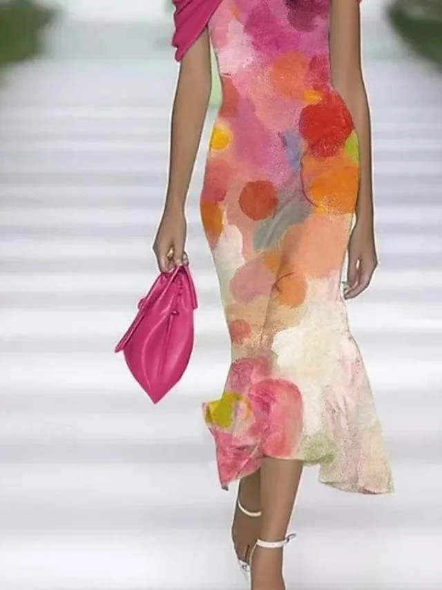 Dieses elegante Midikleid vereint feminine Raffinesse mit moderner Leichtigkeit. Die schmeichelnde Silhouette, das florale Grafikmuster und der raffinierte Kalter-Schulter-Ausschnitt schaffen einen stilvollen Look für besondere Anlässe und den gehobenen Alltag.