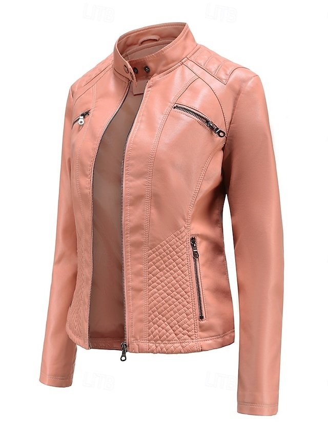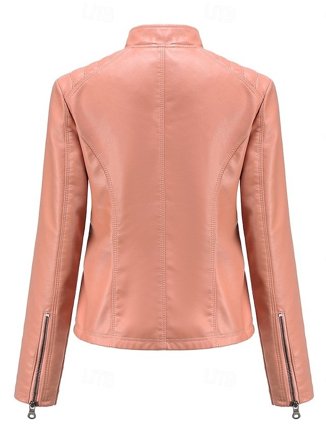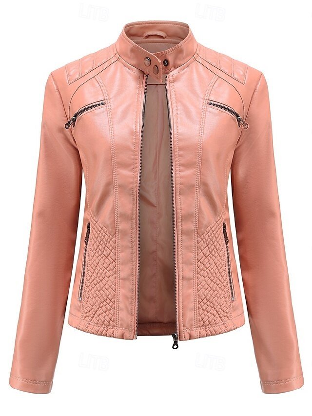 Discover elegance with our Fashion Regular Fit Faux Leather Jacket. Perfect for spring and fall. Available in Black, Pink, and Burgundy.
