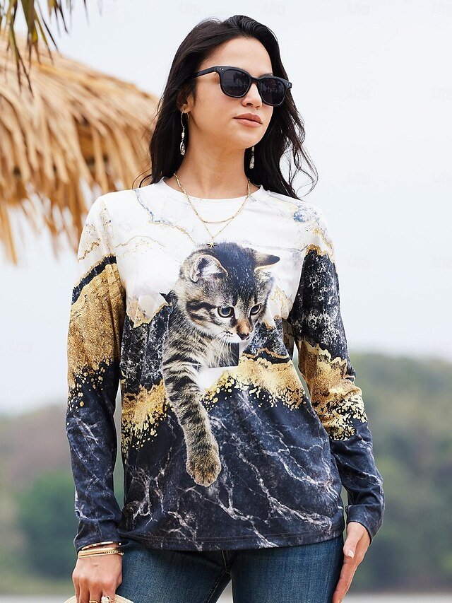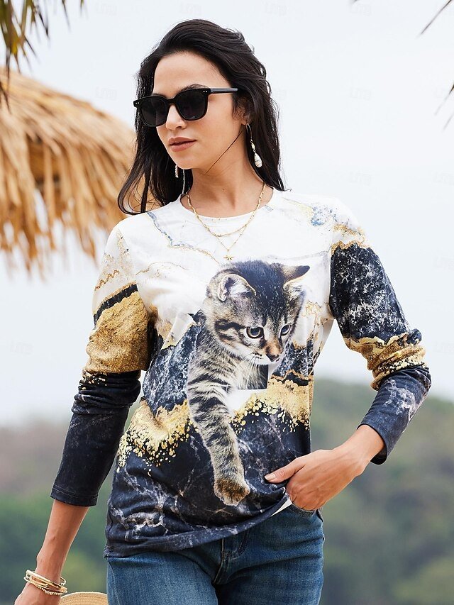 Fashion Regular Funny Cat Print Round Neck Long Sleeve Top