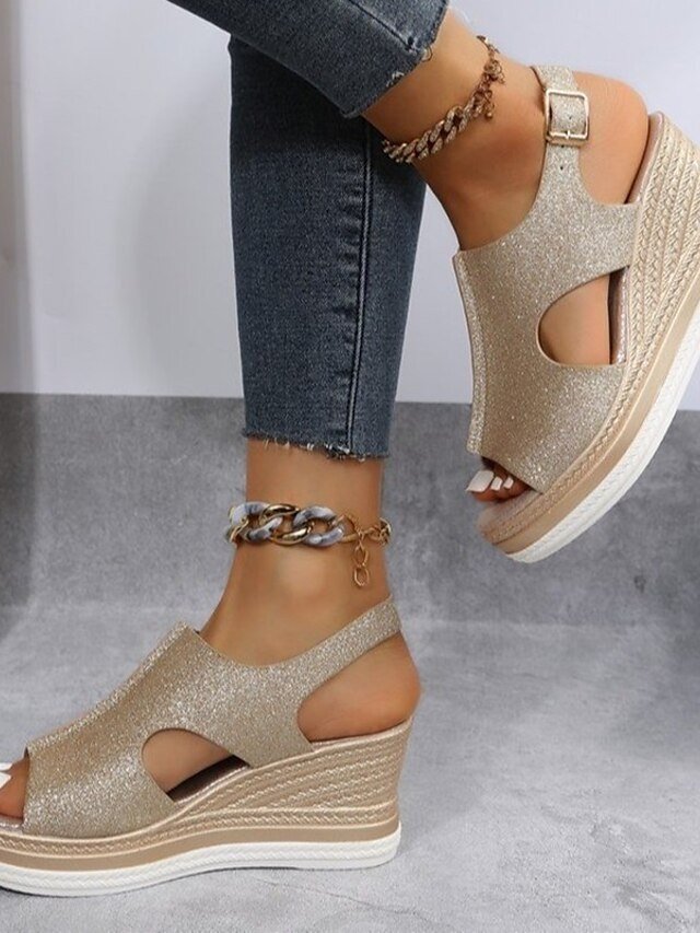 Discover glamorous glitter wedge sandals with open-toe design and cut-out details. Perfect for summer parties and casual outings. Shop now!
