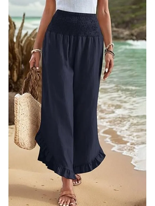 Leichte Damenhose mit elastischem Bund, Rüsche und natürlicher Taille. Jetzt sommerlichen Komfort und Stil entdecken.