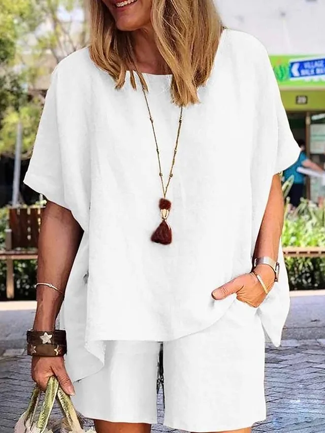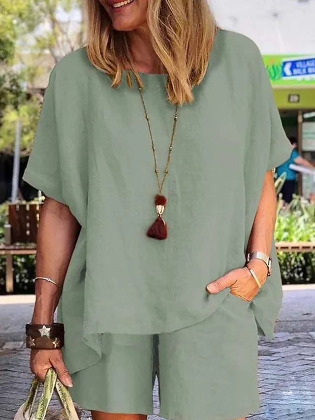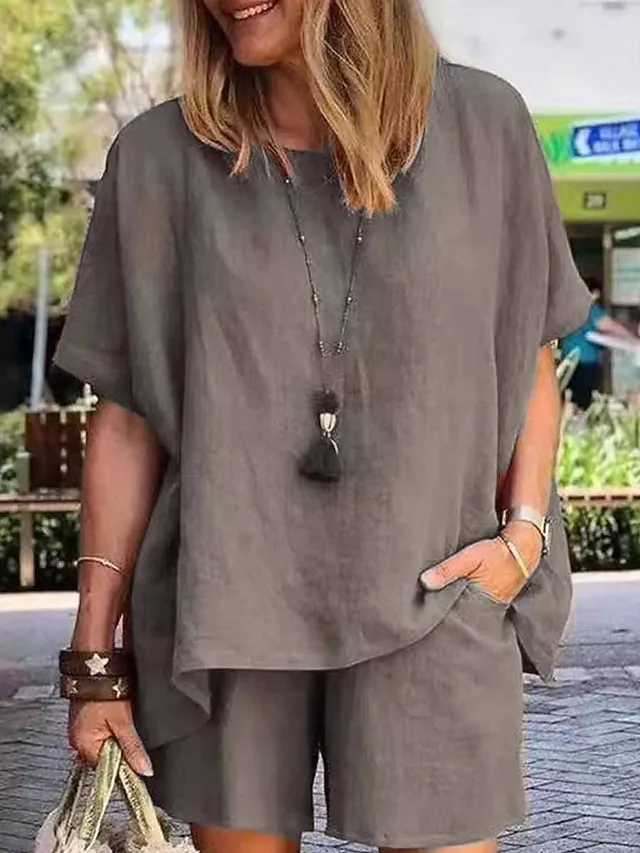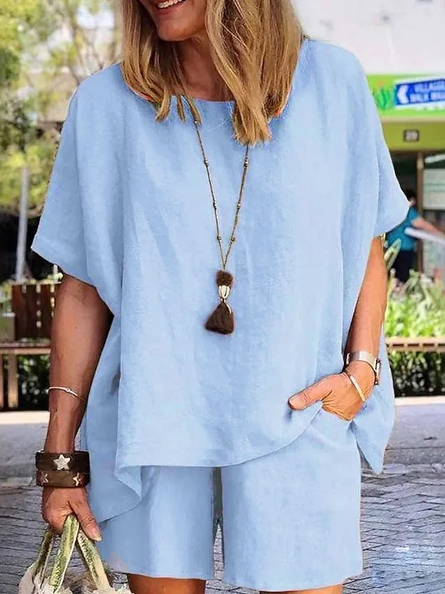 Lässig Locker Einfarbig Rundhals Kurzarm Kurz Zweiteiliges Set