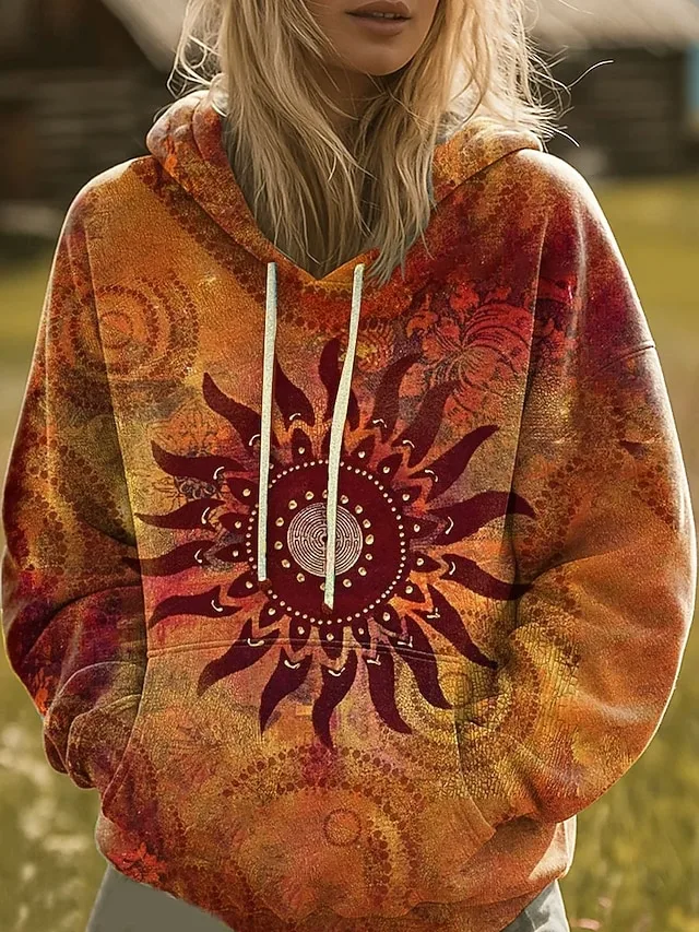 Setzen Sie ein entspanntes Statement mit diesem Boho-inspirierten Hoodie, der lässige Coolness und farbenfrohe Grafik-Details harmonisch verbindet. Der lockere Schnitt und die praktische Fronttasche machen ihn zum idealen Begleiter für stilvolle Wohlfühl-Looks an kühlen Tagen.