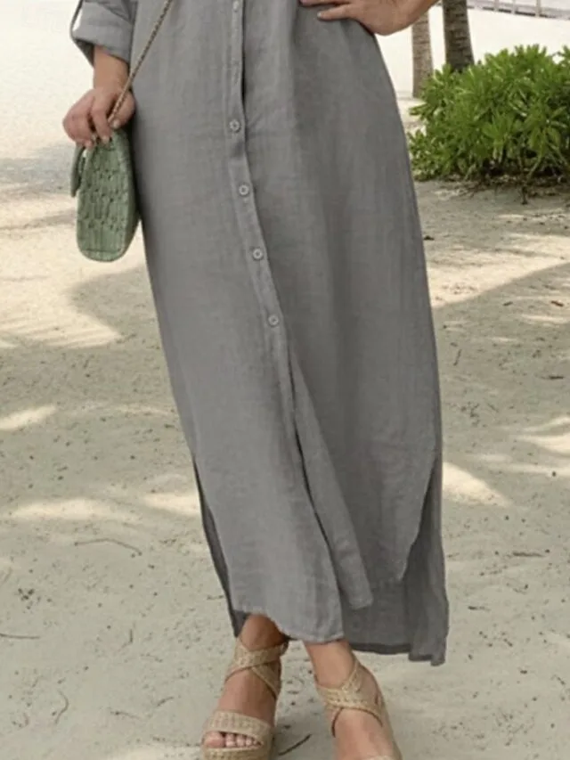 Lässig Lockere Einfarbig Revers Langarm Maxi Kleid