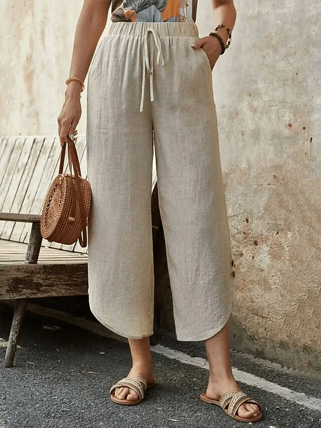 Stilvolle Leinen-Baumwoll Hose mit hohem Bund, elastischem Bund und Taschen. Jetzt entdecken und bequem elegant kombinieren.