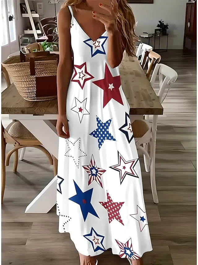 Lässiges Grafik-Maxikleid mit V-Ausschnitt und Spaghetti-Trägern. Perfekt für Sommer, Urlaub und Feiertage. Jetzt entdecken.