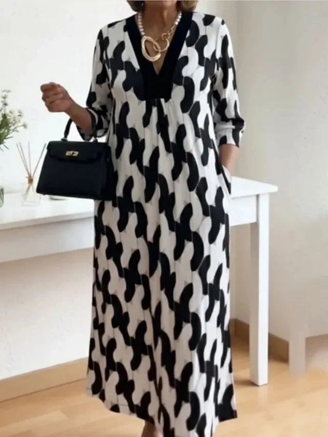 Modernes Midi Kleid mit Grafikmuster, lockerer Passform und V-Ausschnitt. Jetzt stilvoll entdecken und bequem tragen.
