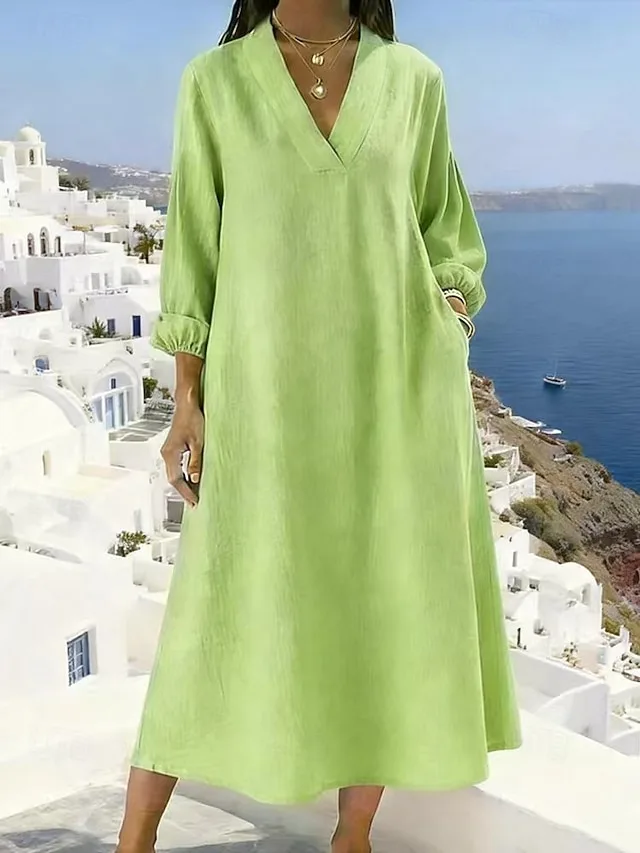 Ein zeitloses Midi-Kleid für mühelose Eleganz im Alltag. Die lockere Silhouette, der schmeichelnde V-Ausschnitt und die klaren Linien verleihen dem Look eine moderne, souveräne Ausstrahlung.