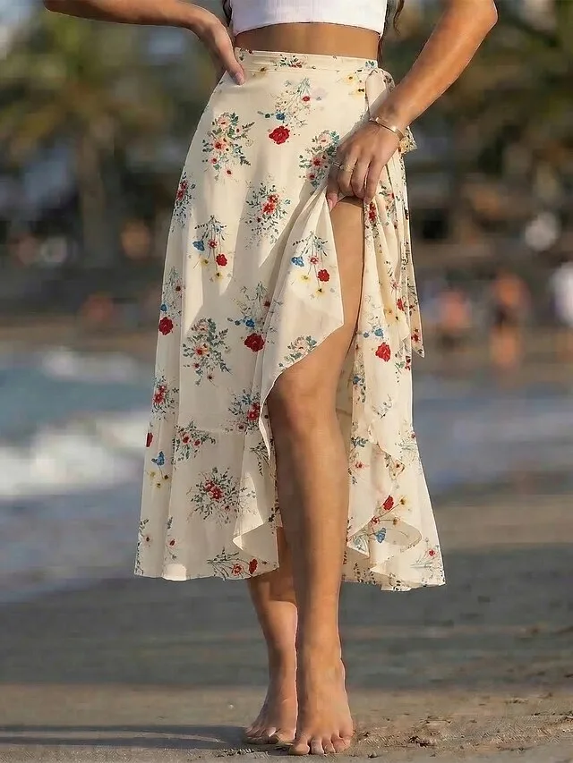 Luftiger Midi-Wickelrock aus Chiffon mit Rüsche und Grafikmuster. Perfekt für Strand, Urlaub und sommerliche Looks.