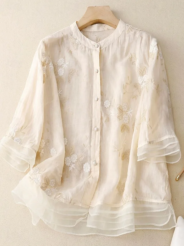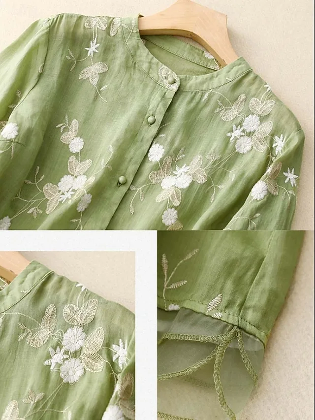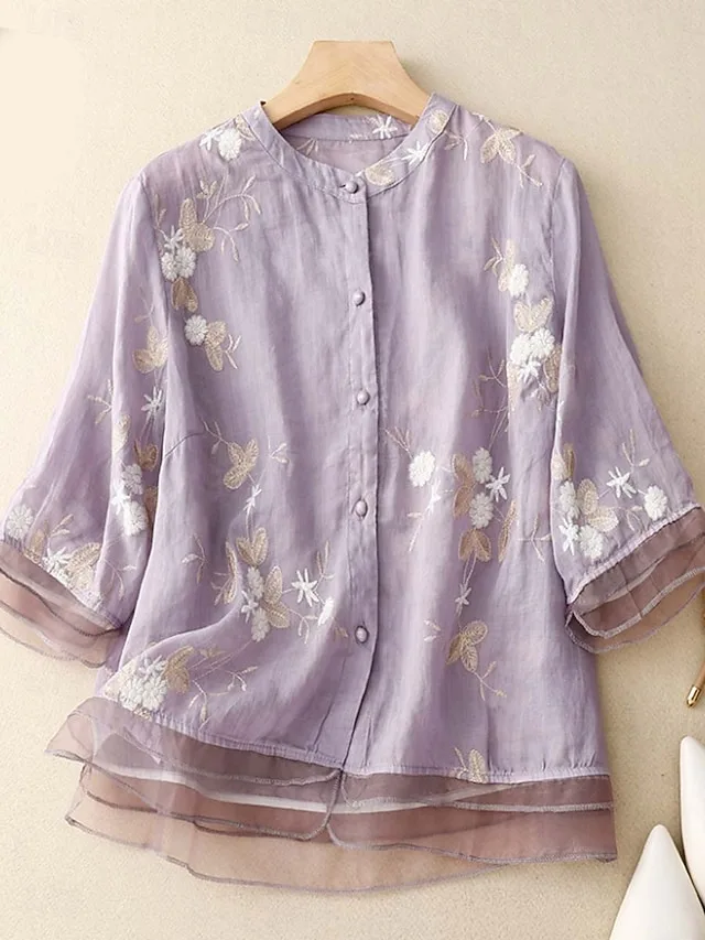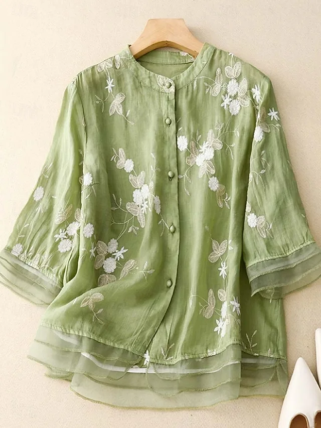 Luftige Hemdbluse aus Baumwolle-Leinen mit Stickerei und Blumenmuster. Stilvoll, bequem und ideal für Alltag und Übergangszeit.