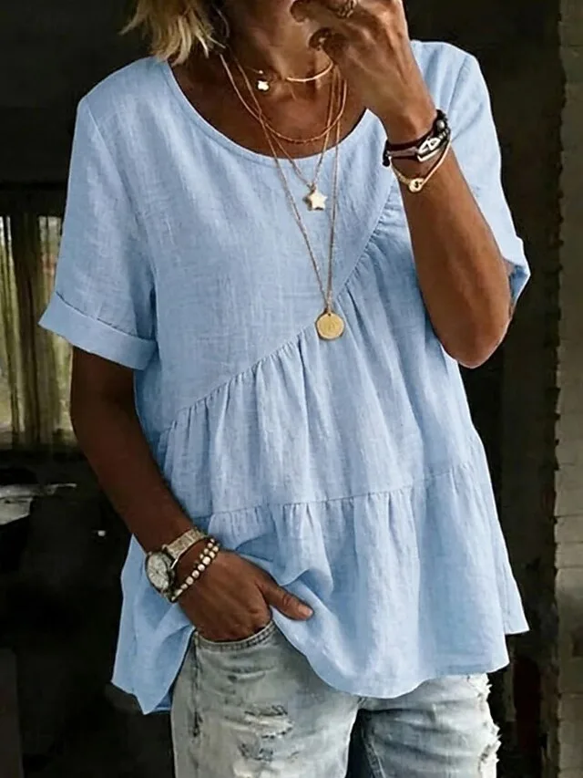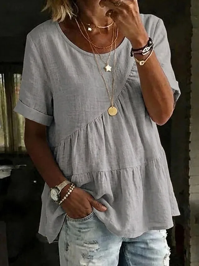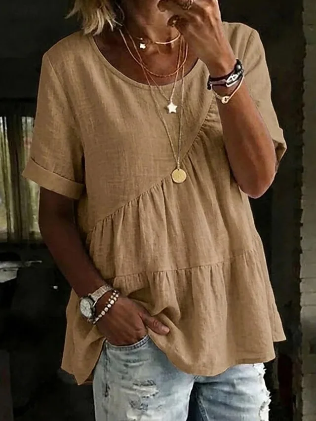 Stilvolles Damen T-Shirt in Leinenoptik mit Rundhalsausschnitt und Kurzarm. Perfekt für Alltag, Ausgehen und Wochenende – jetzt entdecken.
