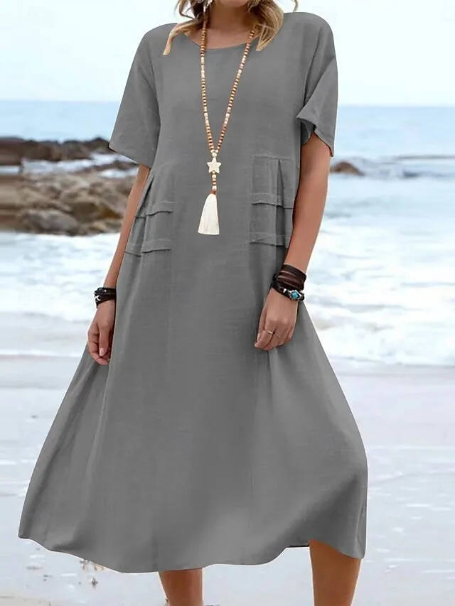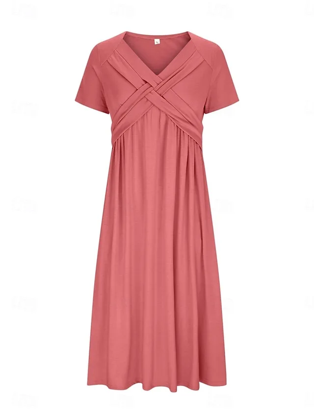 Stilvolles Midikleid in A-Linie mit V-Ausschnitt und Kurzarm. Perfekt für Frühling und Sommer – jetzt entdecken.