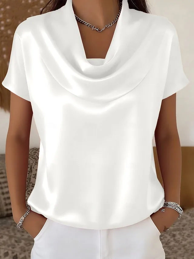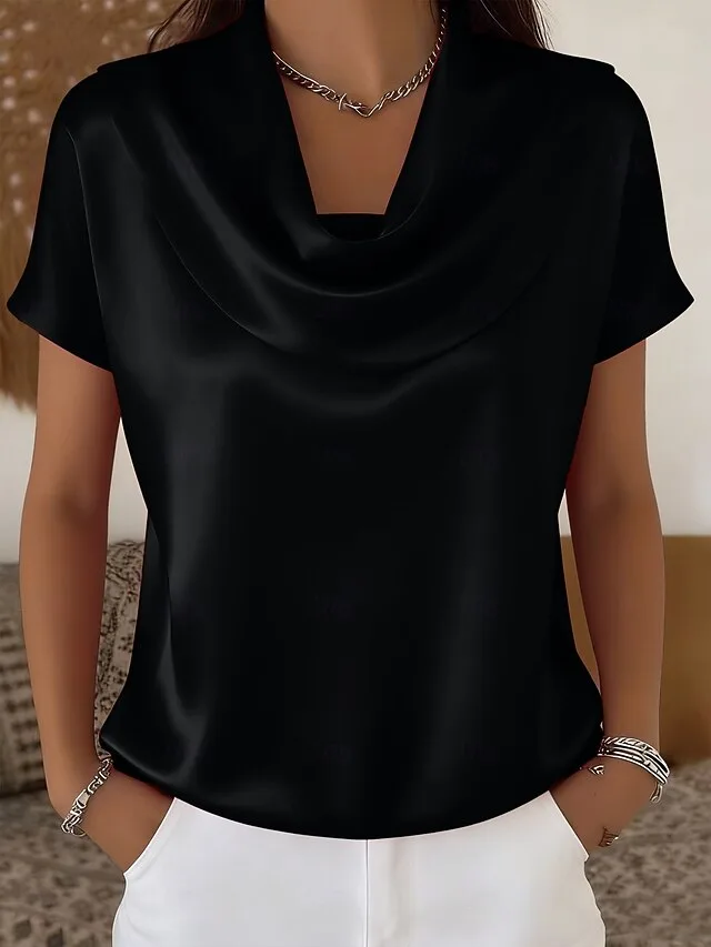 Stilvolle Satin-Bluse mit Wasserfallausschnitt und Kurzarm. Perfekt für Alltag, Frühling und Sommer – jetzt entdecken.