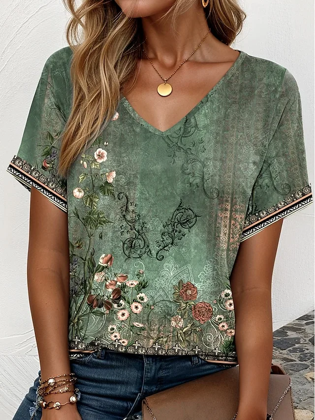 Elegantes Damen T-Shirt mit Ombre-Blumenprint, V-Ausschnitt und Kurzarm. Perfekt für Alltag, Wochenende und Urlaub – jetzt entdecken.