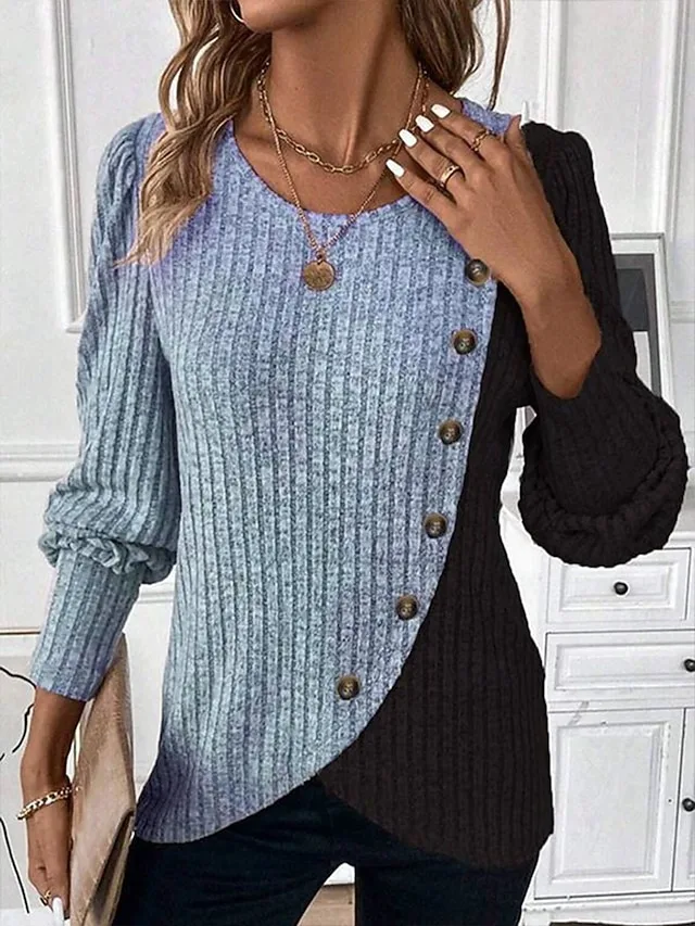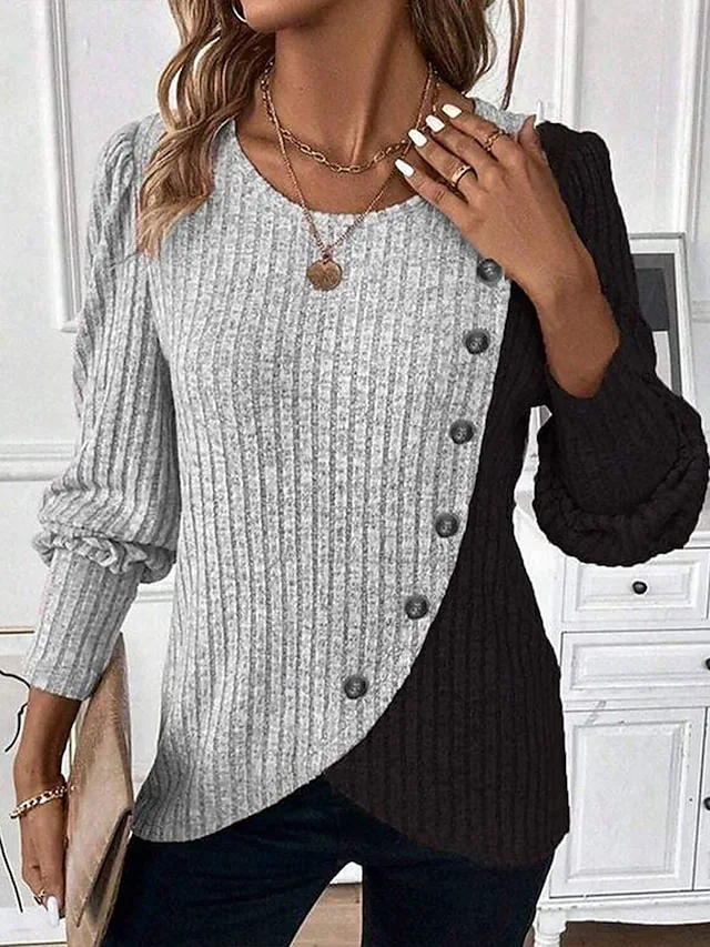 Moderne Damen Bluse mit Patchwork, Knöpfen und Farbblock-Muster. Jetzt entdecken und stilvoll durch Frühling, Herbst und Winter gehen.