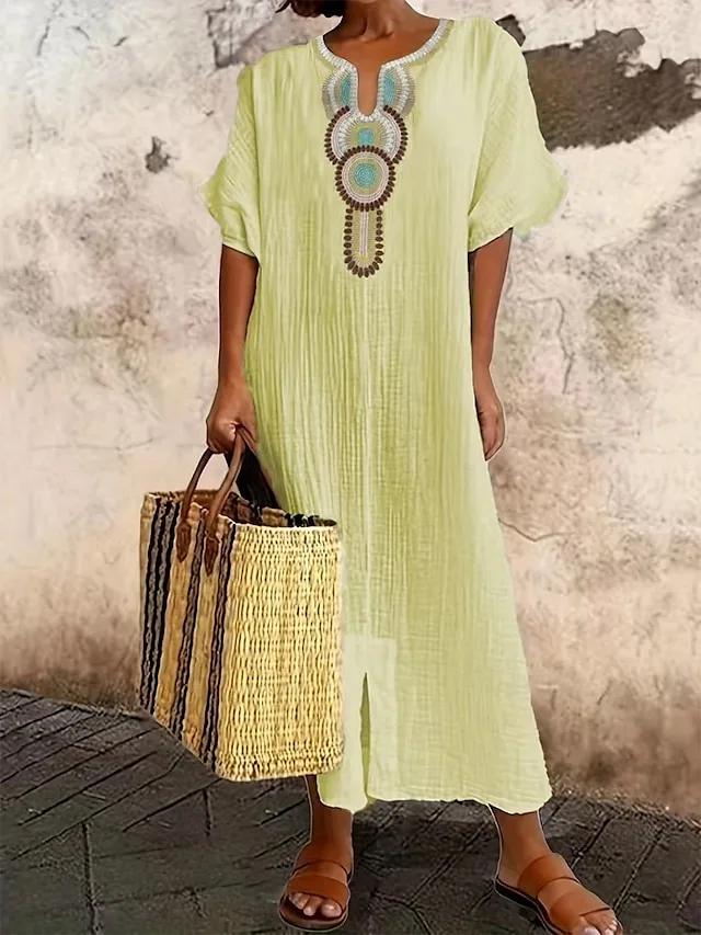 Lässiges Maxikleid mit geometrischem Muster, V-Ausschnitt und Halbarm. Ideal für Frühling und Sommer – jetzt entdecken.