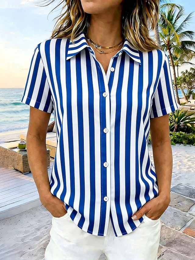 Lässig Normale Gestreifte Geometrische Hemdkragen Kurzarm Oberteil