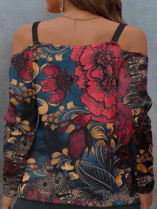 Modische florale Bluse mit schulterfreiem Design und Langarm. Perfekt für Frühling und Herbst – jetzt stilvoll entdecken.