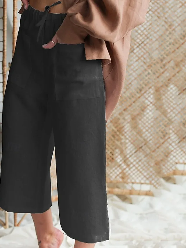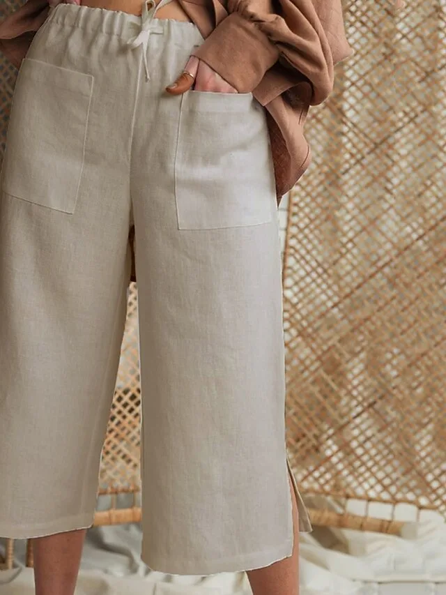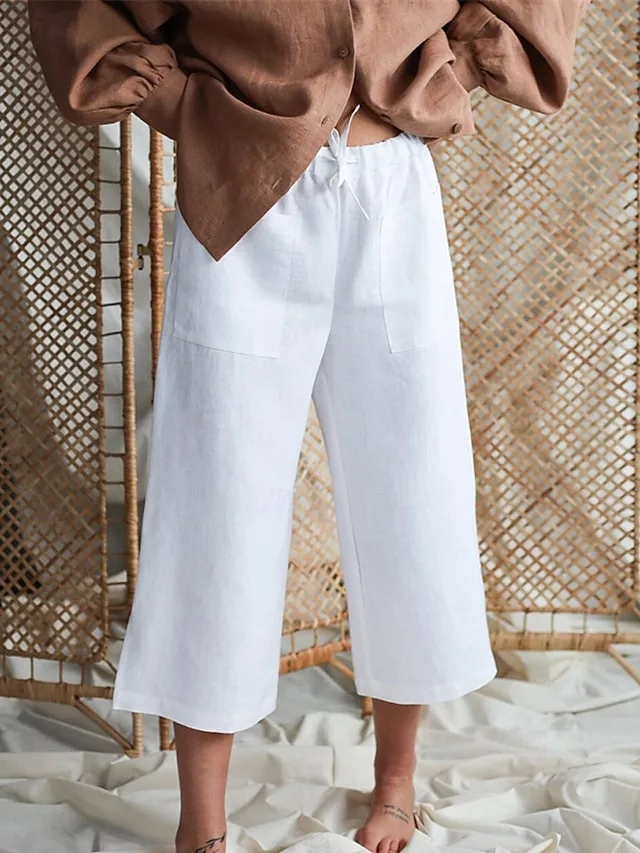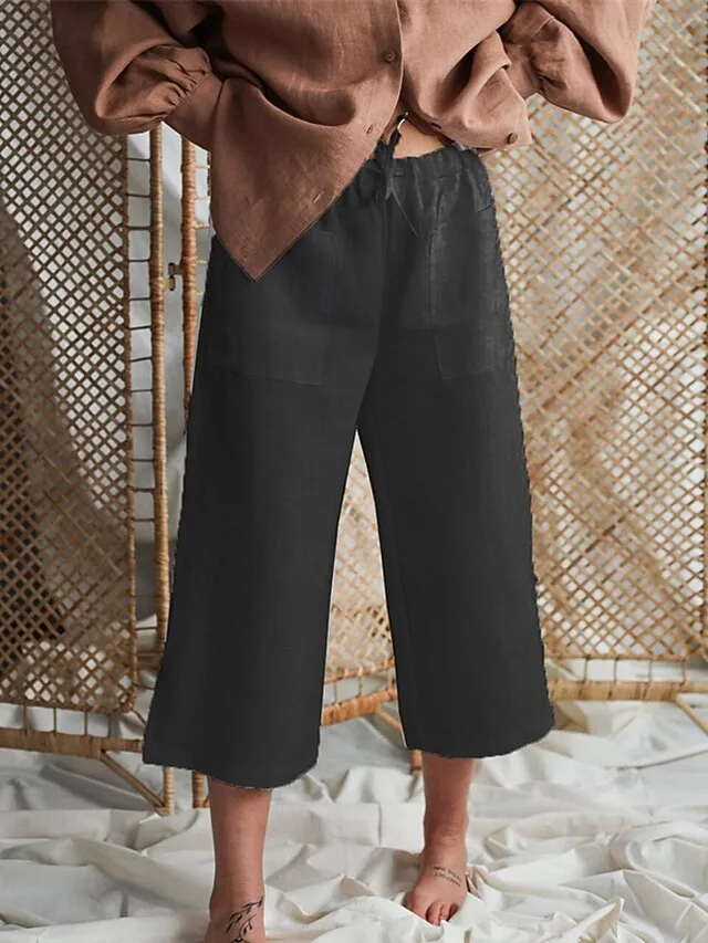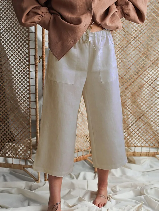 Gefertigt aus einem hochwertigen Baumwoll-Leinen-Mix, bietet diese Hose angenehmen Komfort und ein luftiges Tragegefühl für warme Tage. Der elastische Bund mit Kordelzug unterstreicht die bequeme Passform, während die knöchellange Form und das schlichte Design vielseitige Styling-Möglichkeiten eröffnen.