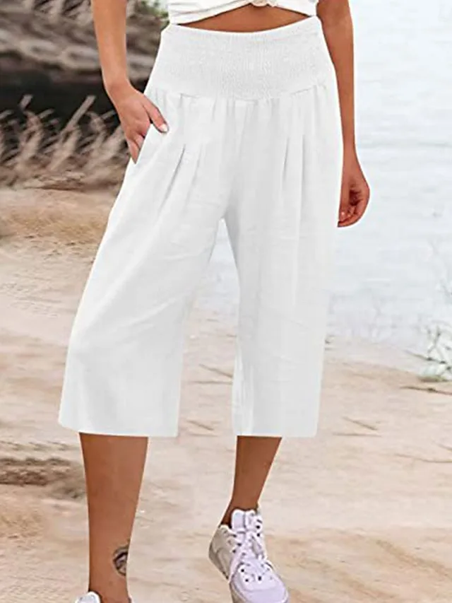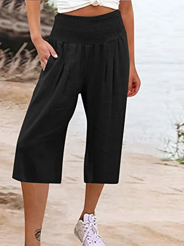Lässig Weit Einfarbig Hohe Taille Elastischer Bund Wadenlang Hose