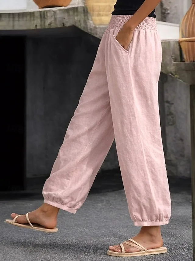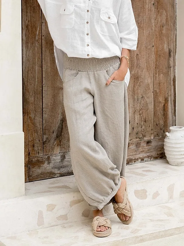 Leichte Damenhose aus Baumwoll-Leinen mit weitem Bein, hohem Bund und elastischem Komfort. Jetzt stilvoll entdecken.