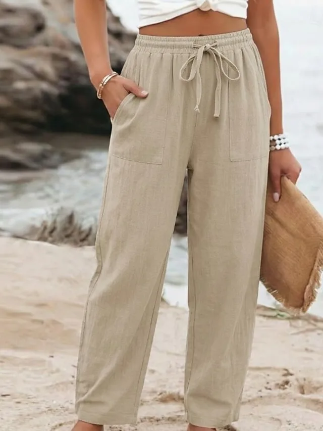 Leichte Baumwollleinen Hose mit hoher Taille, Taschen und Kordelzug. Jetzt stilvoll und bequem für den Alltag entdecken.