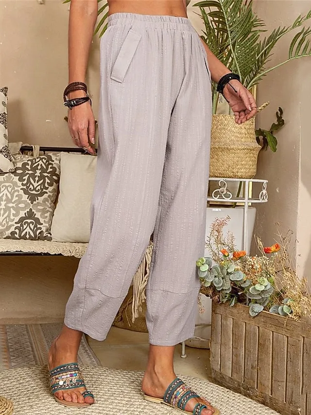 Stilvolle Baumwoll-Leinen-Hose mit hohem Bund und Taschen. Leicht, bequem und perfekt für Frühling und Sommer – jetzt entdecken.
