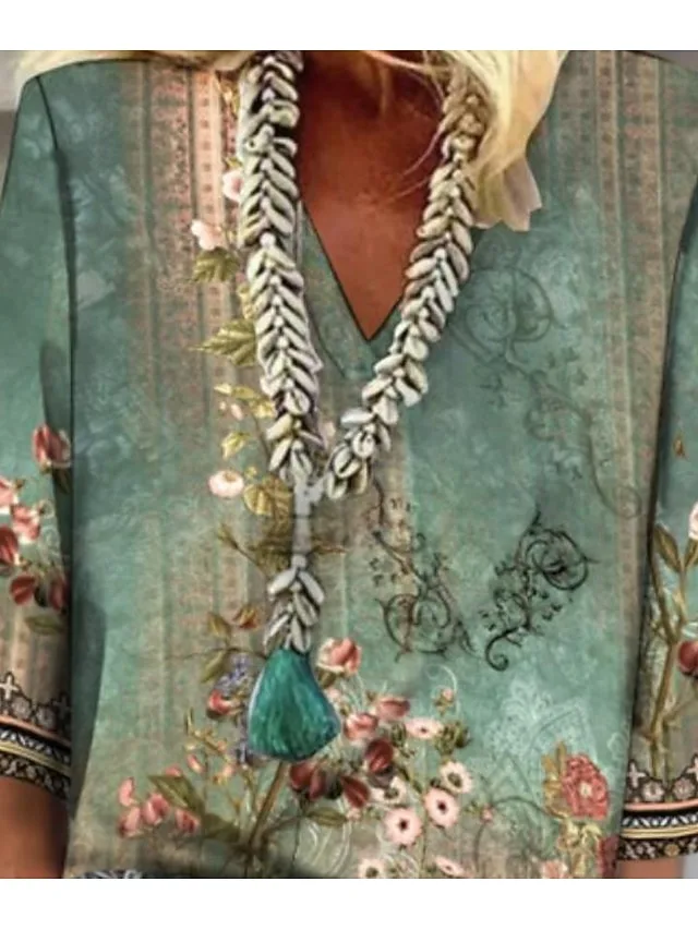 Elegante florale Bluse mit V-Ausschnitt und Dreiviertelarm. Leicht, bequem und perfekt für Frühling und Sommer. Jetzt entdecken.