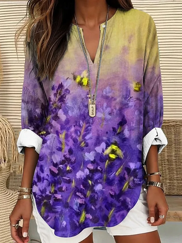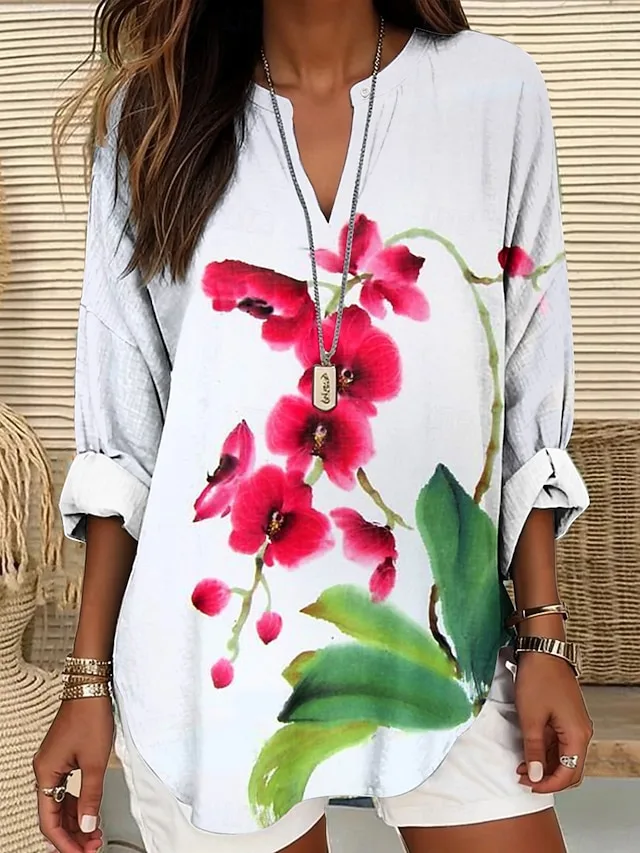 Leichte Bluse mit floralem Druck, V-Ausschnitt und Langarm. Perfekt für Alltag, Urlaub und stilvolle Sommerlooks.