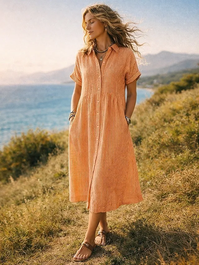 Stilvolles gestreiftes Midi-Hemdblusenkleid mit lockerer Passform. Perfekt für Alltag, Urlaub und Ausgehen – jetzt entdecken.
