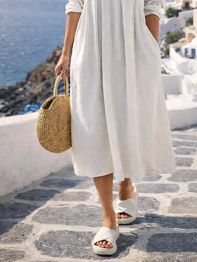 Stilvolles Midikleid aus Baumwoll-Leinen mit V-Ausschnitt und lockerer Passform. Ideal für Alltag, Urlaub und Ausgehen.
