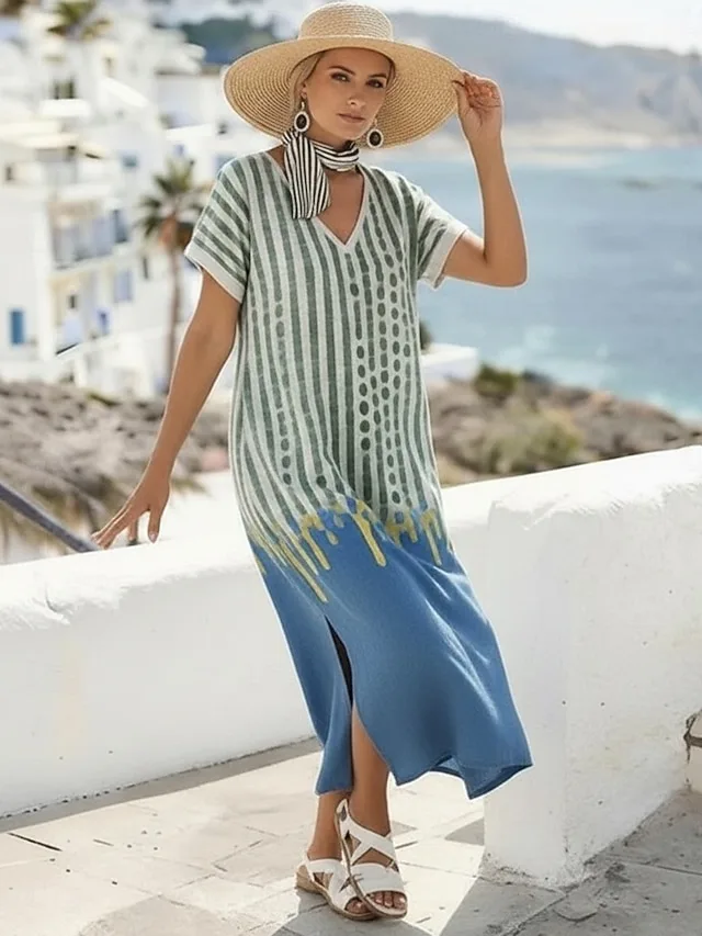 Modernes Ombre-Midikleid mit geometrischem Print, V-Ausschnitt und lockerer Passform. Perfekt für Urlaub, Outdoor und Wochenende.