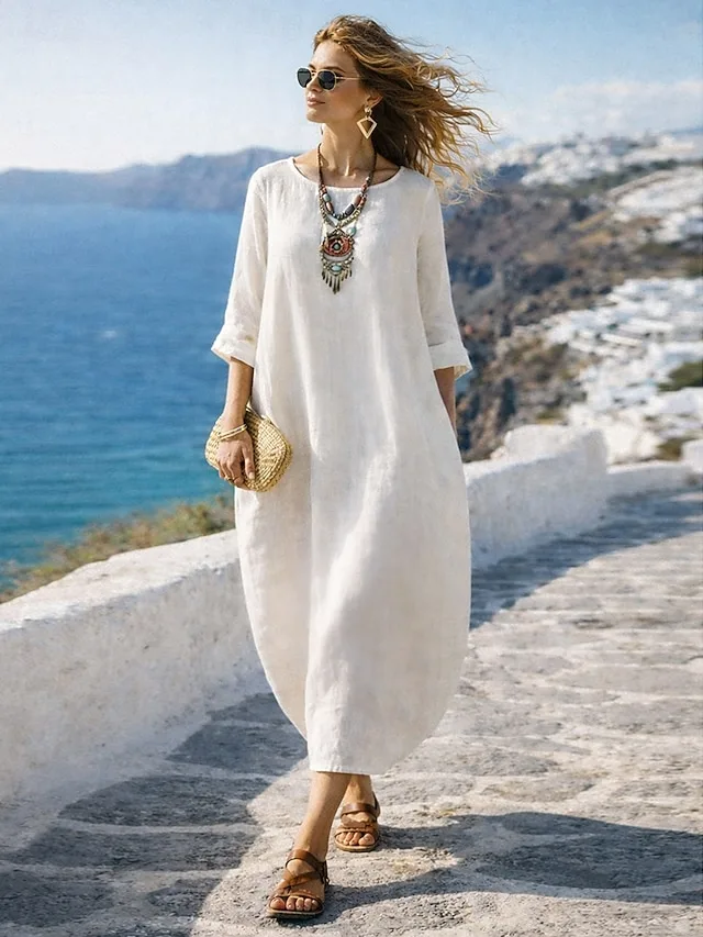 Elegantes Maxikleid aus Baumwoll-Leinen mit lässigem Schnitt und Raffung. Jetzt entdecken und stilvoll durch Alltag und Urlaub gehen.