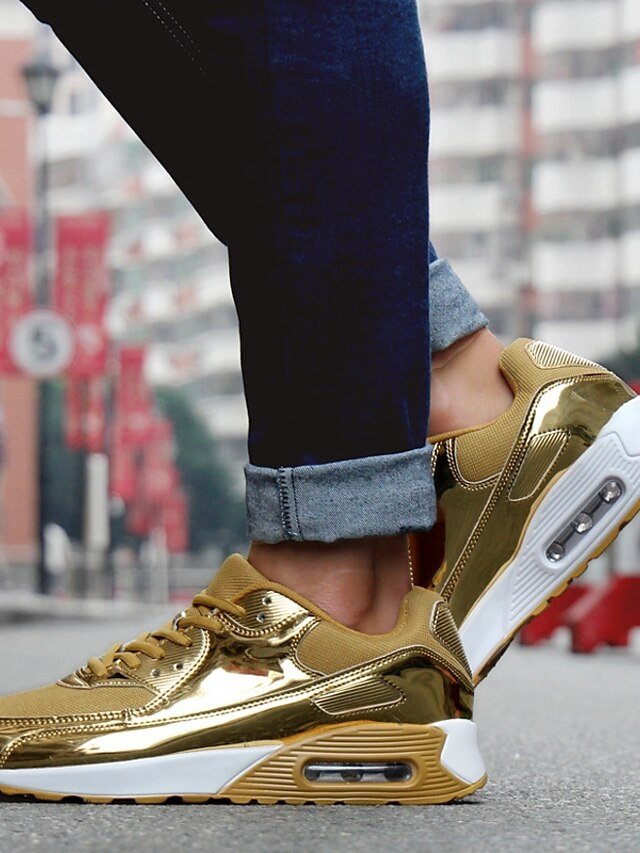 Discover our gold metallic running shoes with air cushion sole, expertly blending sport and fashion. Shop the latest trends in plus-size footwear.