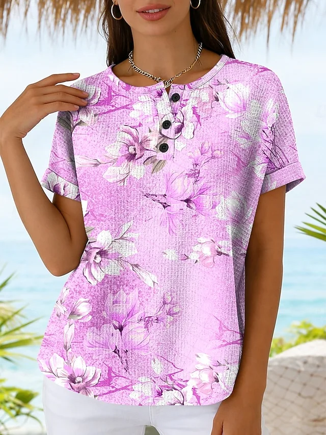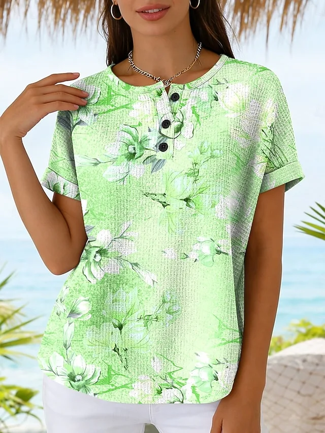 Stilvolles Damen T-Shirt mit Blumen- und Grafikdruck, Rundhalsausschnitt und Kurzarm. Perfekt für Frühling und Sommer – jetzt entdecken!