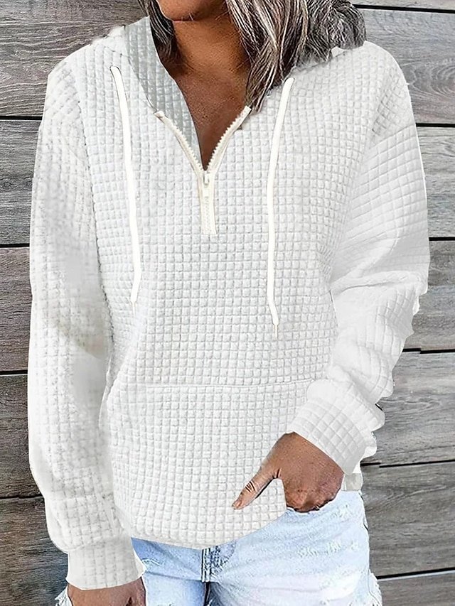 Step into a world of comfort and style with our Street Casual Regular Solid Half Zip Long Sleeve Hoodie. Perfectly versatile, this hoodie is the quintessential piece for any wardrobe, seamlessly transitioning from autumn to winter while imbuing your look with chic nonchalance. Available in a range of elegant hues, including black, white, pink, khaki, and dark blue, it promises to be a timeless addition to your collection.