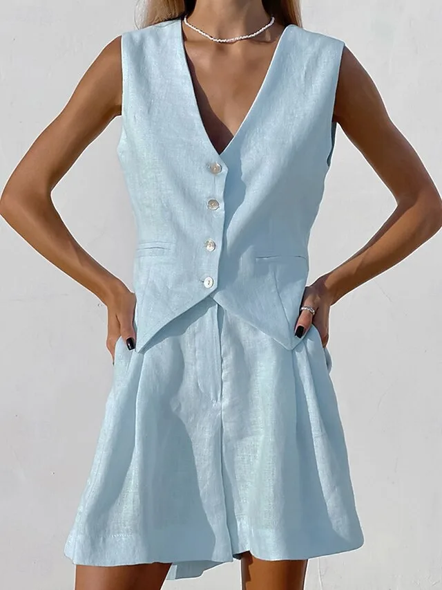 Stilvolles Baumwoll-Leinen-Set mit Cut-outs und V-Ausschnitt. Jetzt entdecken und sommerliche Looks elegant abrunden.