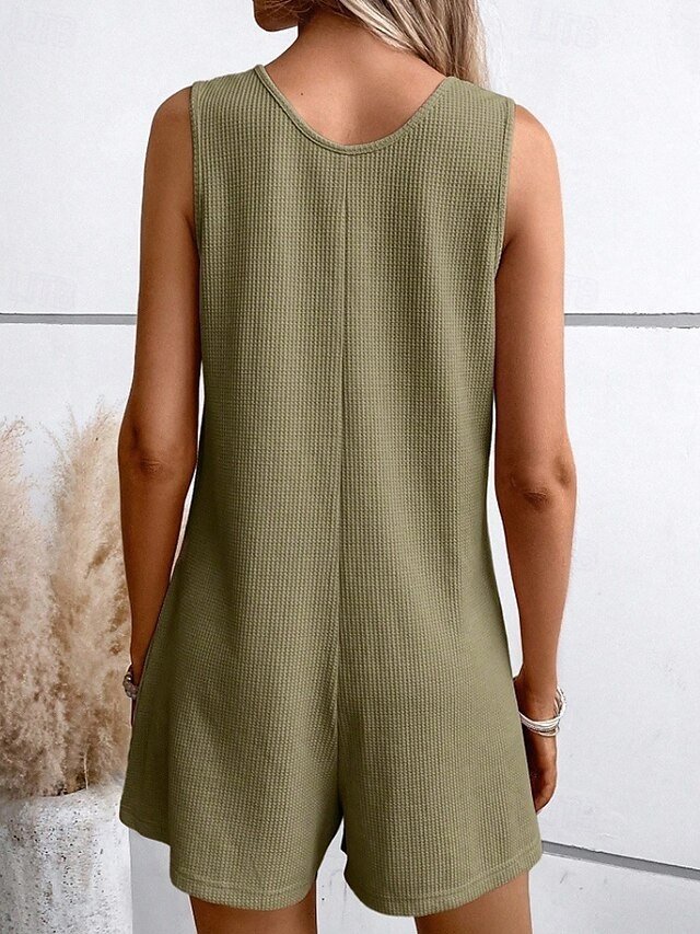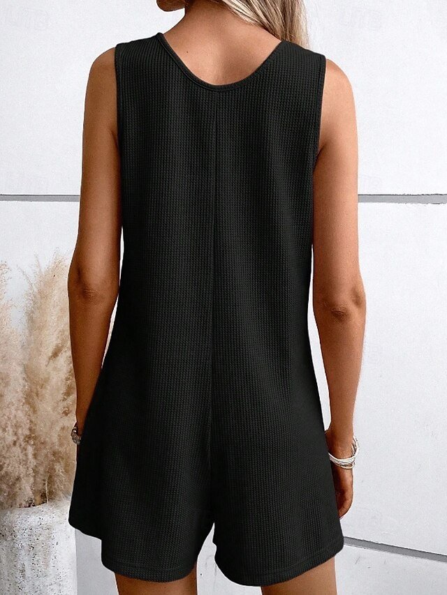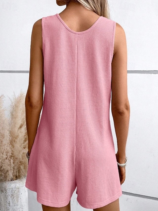 Discover chic streetwear style with our solid U neck sleeveless romper, available in black, light green, and pink. Perfect for summer days.