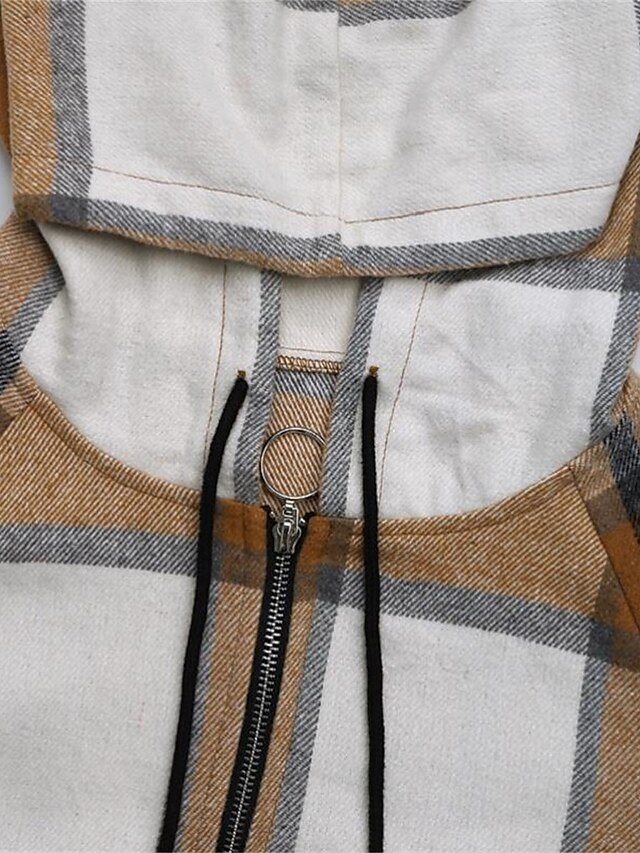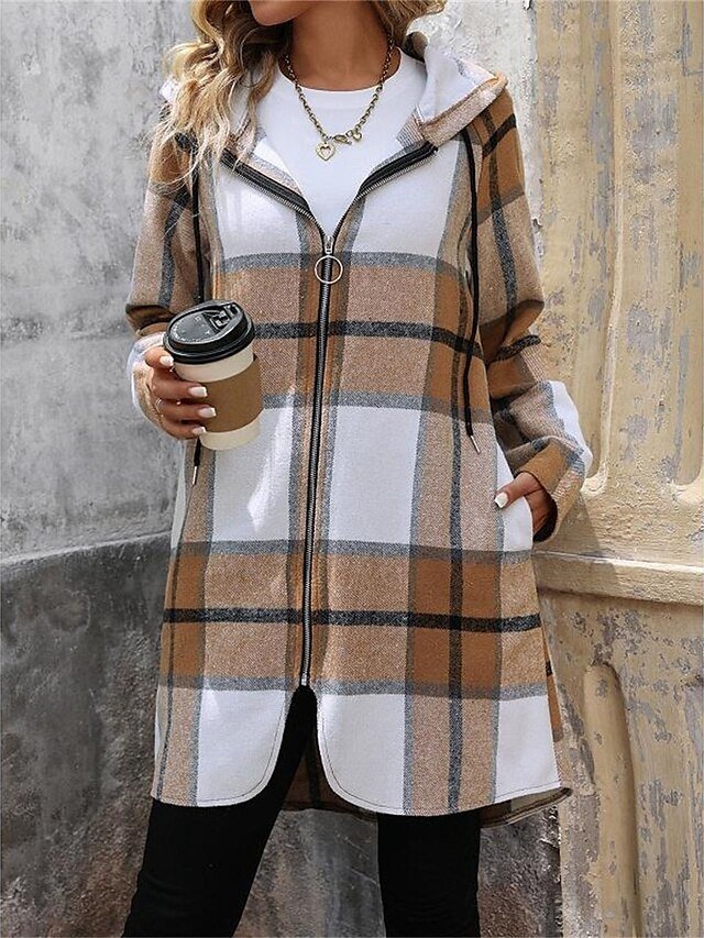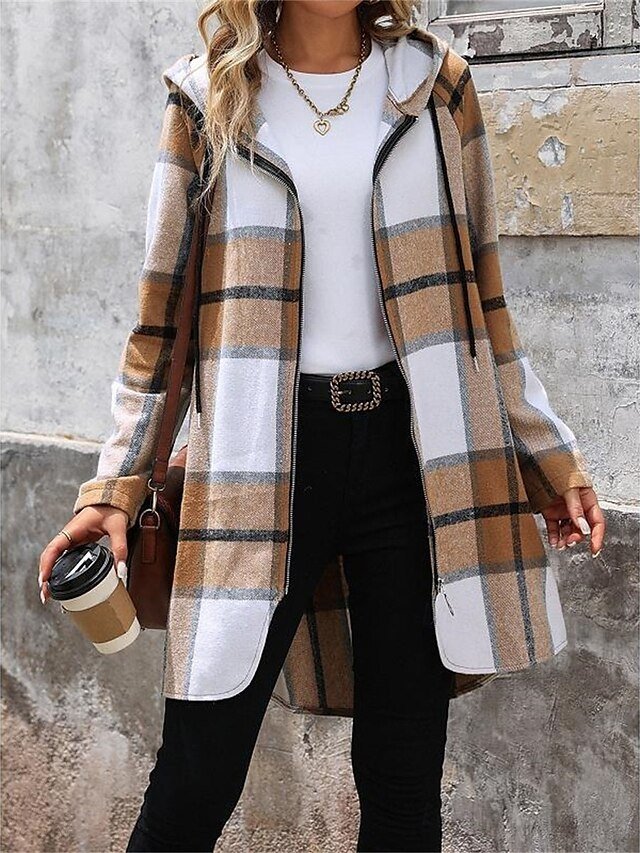 Stay chic and warm in our Stylish Casual Stripes and Plaid Hoodie Long Coat. Perfect for winter, offering comfort and elegance. Available in multiple sizes.