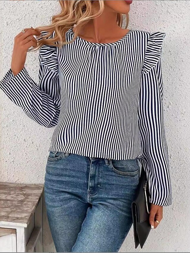 Discover our elegant striped tunic with asymmetric hem, perfect for work or daily wear. Available in blue, ideal for spring and fall.