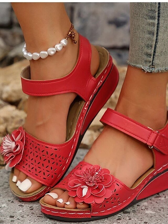 Discover chic red wedge sandals with floral embellishments and adjustable straps. Perfect for elevating summer and casual outfits.